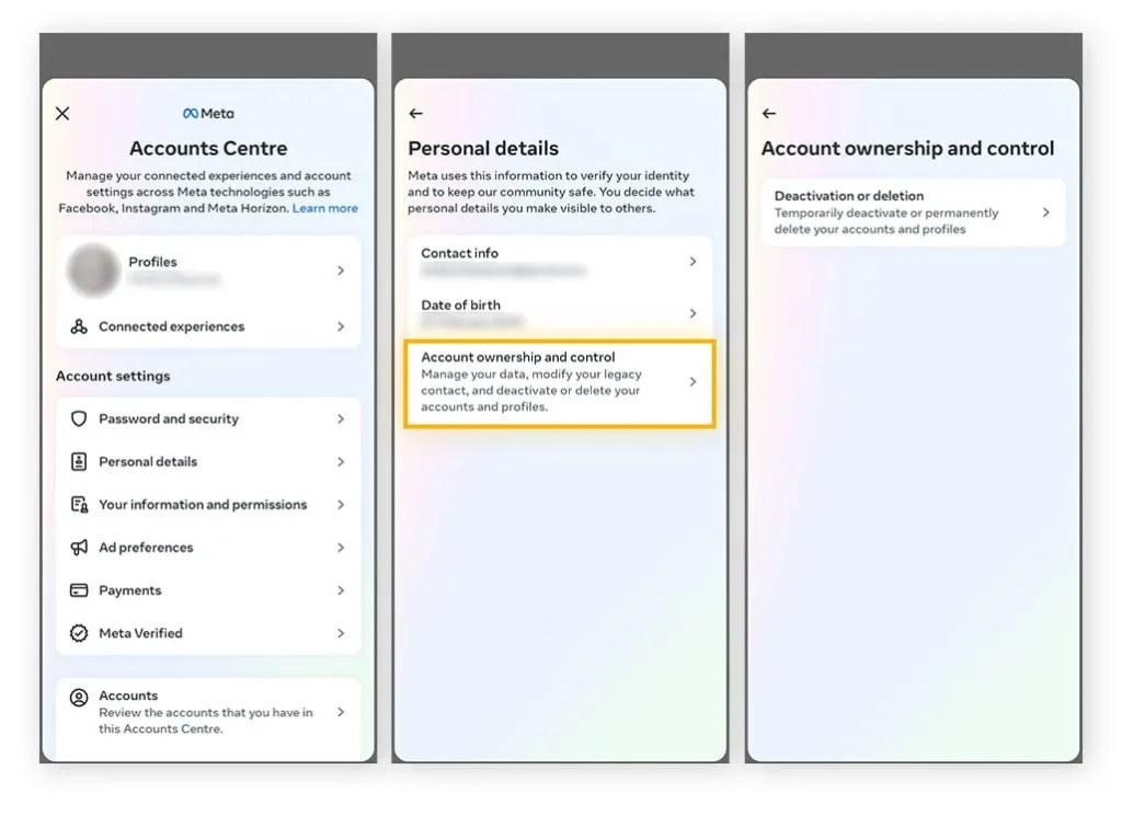 2. روی جزئیات شخصی (Personal details) > مالکیت و کنترل حساب (Account ownership and control) > غیرفعال کردن یا حذف (Deactivation or deletion) ضربه بزنید.