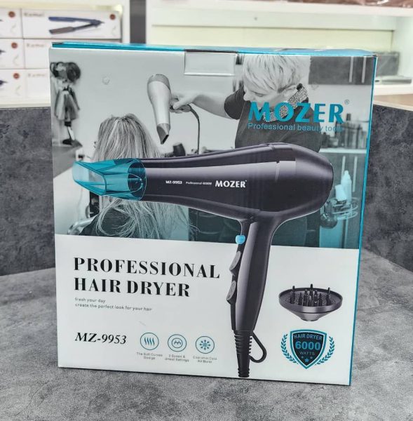 سشوار موتور سنگین فوق حرفه ای  MOZER مدل MZ-9953 دارای طراحی ارگونومیک و بی نظیر است.این دستگاه با کیفیت بسیار عالی و درجه یک ساخته شده است. دارای طراحی زیبا و وزن بسیار سبک که باعث راحتی نگهداری دستگاه و استفاده از آن می گردد. بدنه آن پلاستیک فشرده و محکم و مقاوم در برابر ضربه و بسیار خوش رنگ است. موتور دستگاه فوق سنگین و بسیار قدرتمند با پرتاب باد بسیار عالی طراحی شده است. قدرت توان آن نیز 6000 وات است. این موتور از نوع AC سنگین است. المنت های دستگاه دارای پوشش سرامیکی می باشند. کابل دستگاه ژله ای و طول آن بلند می باشد. همچنین دارای سیم گردان است که هنگام کار با آن مانور بیشتری به دست کاربر می دهد و از پوسیدگی و خراب شدن آن نیز جلوگیری می کند. علاوه بر این دارای حلقه آویز جهت آویزان کردن آن در حین انجام کار می باشد.